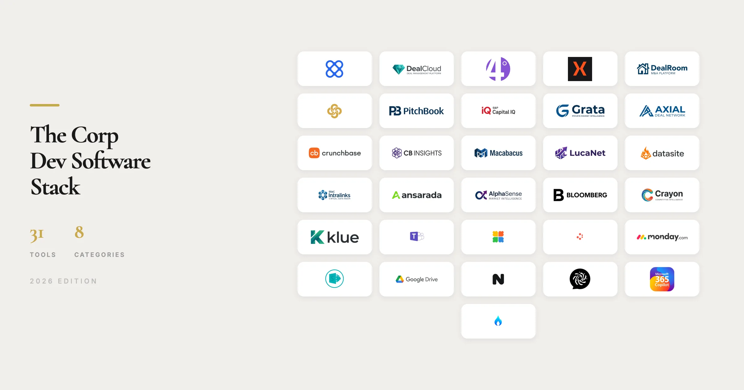 32 tools. Real pricing. Honest verdicts. The practitioner’s guide to every software category corp dev teams use, from M&A CRM to AI tools.