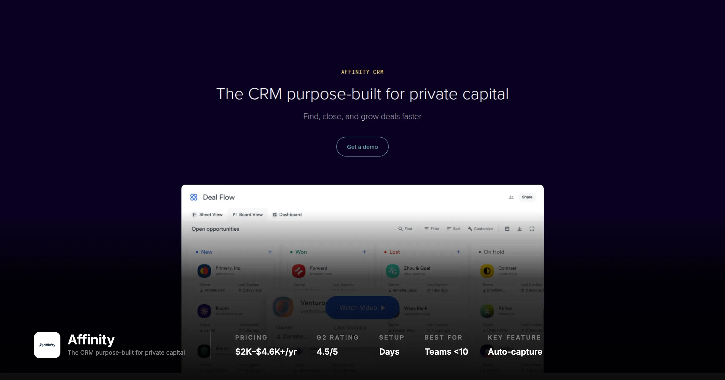 Faster implementation than DealCloud | Primary focus is VC/PE; corp dev is a secondary use caseOur Take: Deserves a demo if you are evaluating M&A CRMs and want automation without Affinity's analytical ceiling and DealCloud's price tag. Get a corp dev-specific reference before buying. The logic is sound; the evidence base is just thinner than competitors.