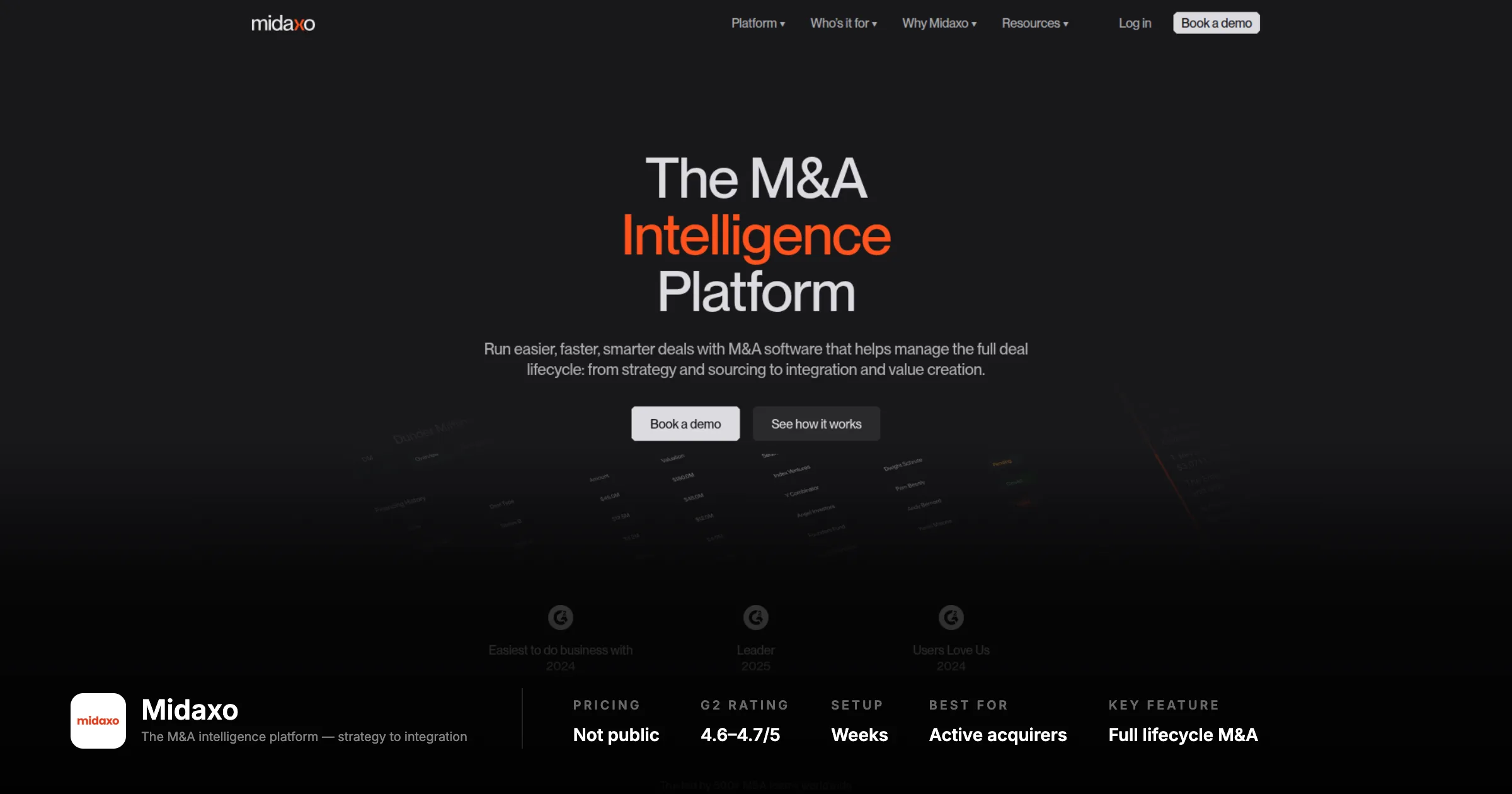 Midaxo occupies a different position than the CRM-first tools. Where DealCloud and Affinity are primarily about pipeline and contacts, Midaxo connects the entire M&A lifecycle: strategy alignment, deal sourcing, pipeline, due diligence, and post-merger integration in a single platform. Named a Leader in the 2024 IDC MarketScape for M&A software. For an active corporate acquirer whose operational pain is the fragmentation across sourcing, diligence, and integration tools, this is the most purpose-built solution in the market.