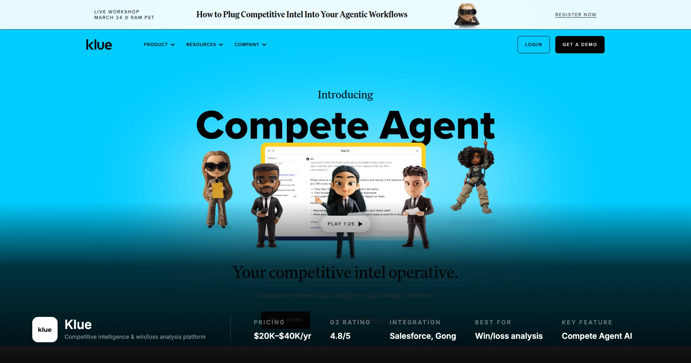 Klue's Salesforce integration and battlecard distribution deliver competitive content to sales reps in their active deal workflow | Battlecard and win/loss models have no analogue in corp dev work; the organizing logic of both tools does not translate to acquisition research