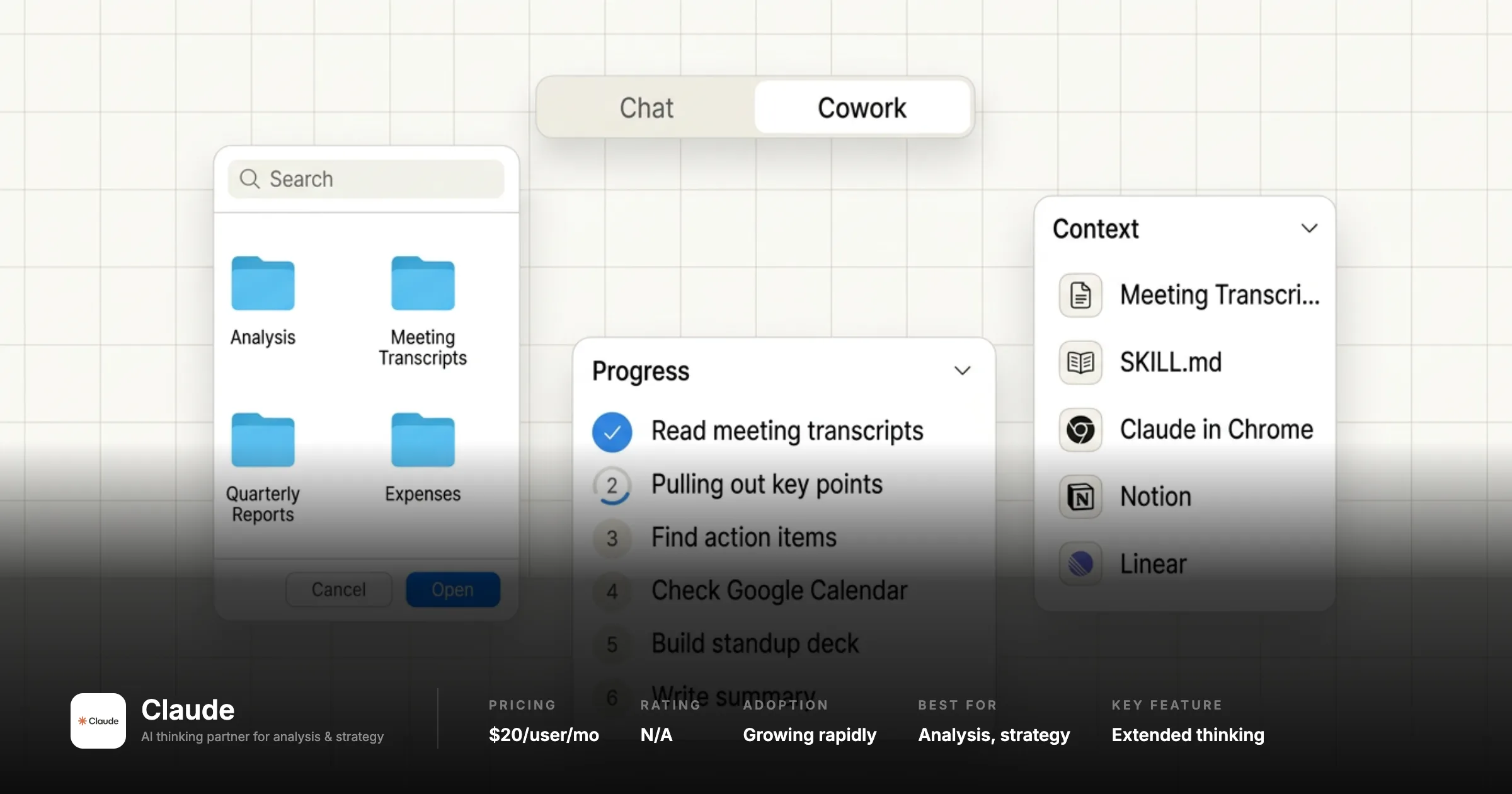Our Take: Worth running alongside ChatGPT rather than instead of it. The incremental cost is $20/user/month and the use cases are complementary. Long CIM analysis, structured IC memo drafting from a detailed brief, and complex diligence synthesis are where Claude tends to outperform ChatGPT for corp dev work.