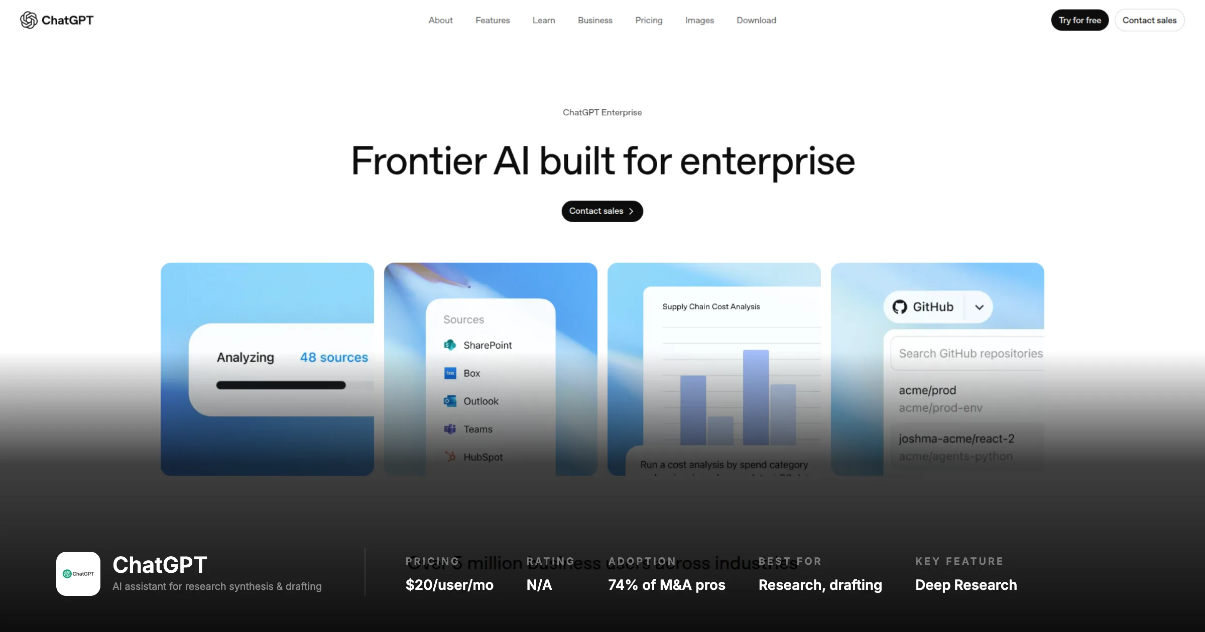 ChatGPT Pro is the most widely deployed general AI tool in corp dev contexts. At $20 per user per month, it is the highest-ROI spend on this list relative to the time it saves on research synthesis and document drafting. A corp dev analyst who uses it effectively for sector research synthesis and IC memo first drafts recovers 3-5 hours per deal. The risk is specific and non-negotiable: ChatGPT produces financial data that looks authoritative and is frequently wrong. Revenue figures, EBITDA multiples, deal comps - any number it produces should be treated as unverified until checked against PitchBook, Capital IQ, or a primary source. Teams that have built this verification habit use it heavily and productively. Teams that have not occasionally push a memo with a wrong number to the IC.