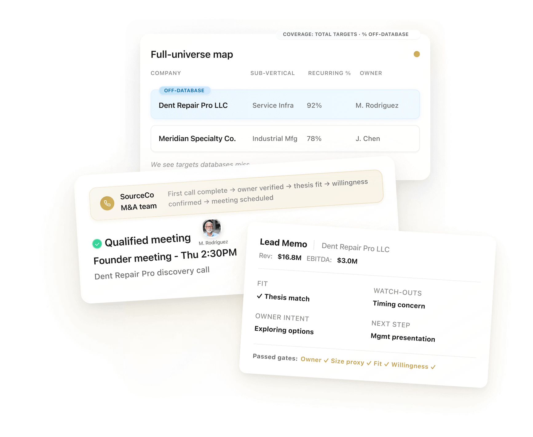 Many of the best add-ons don't show up in databases. We map the full market, including off-database companies, reach owners by email, phone, and mail, qualify on the phone, and hand off only thesis-fit meetings.