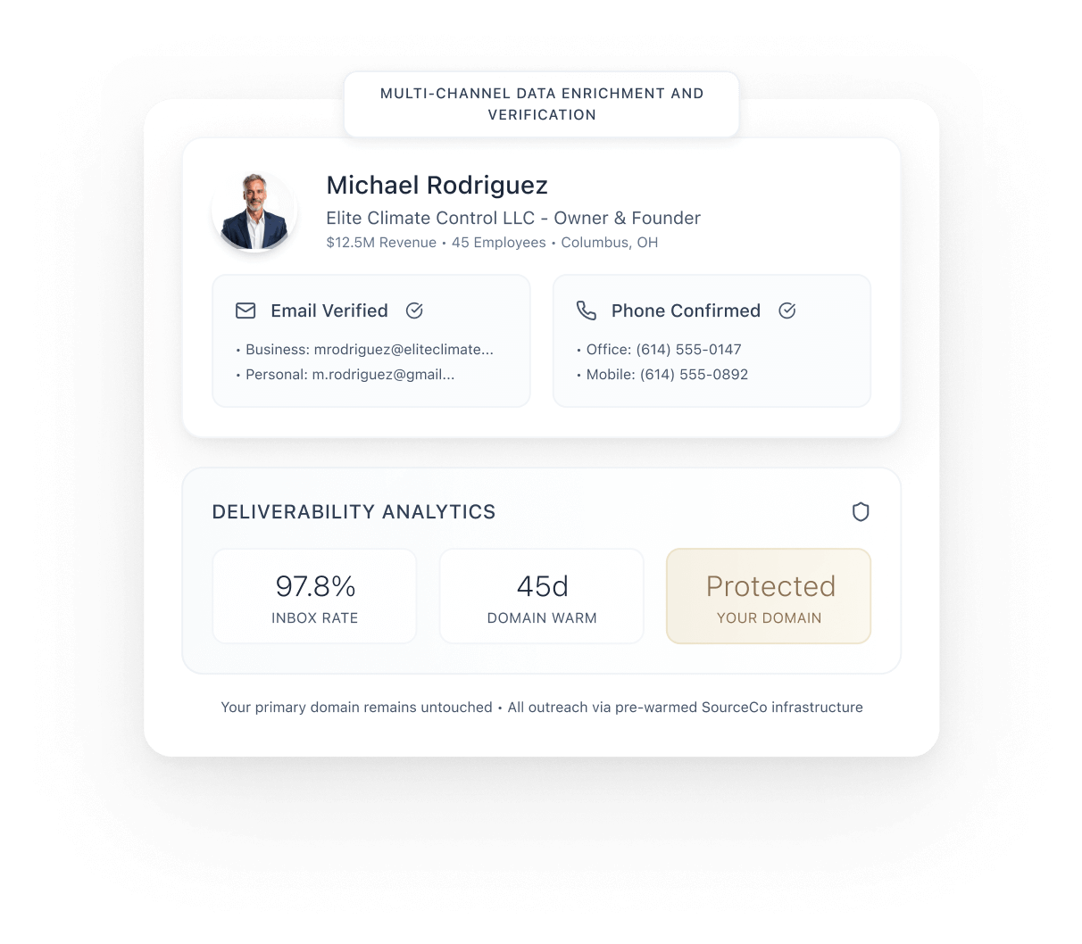 We gather multiple owner contacts (business email, personal email, desk line, cell when available) and confirm phones by dialing. Outreach is highly personalized and thesis-tied to the owner’s context, anchored in your buyer proof (ie. experience, exit stories, vision & cultural fit). Outreach runs from SourceCo sending domains "on behalf of <Your Fund>" so your primary domain stays untouched. To keep placement high, we warm new domains (~30 days), cap daily sends, and rotate to warmed backups if placement dips.