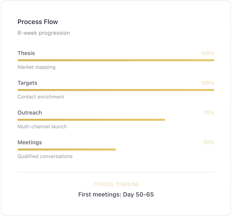 We translate your thesis into a complete target set (incl. off-database firms), build materials that communicate your story, and prepare the tech stack for your campaigns. You review/approve the target set, messaging, and materials.
